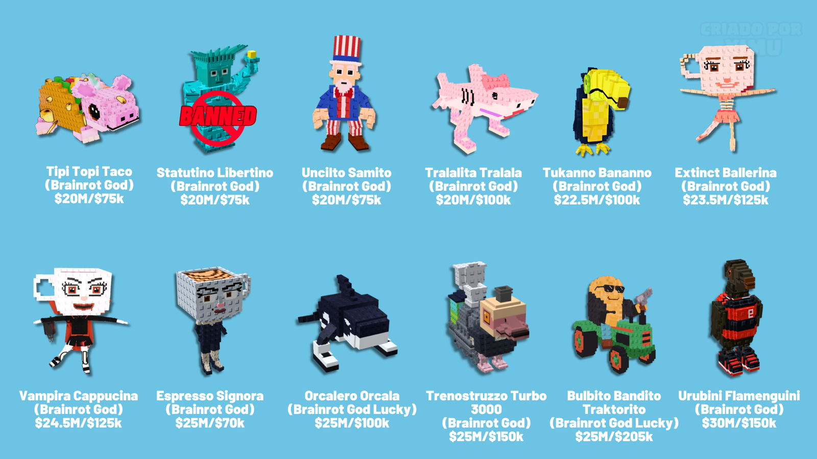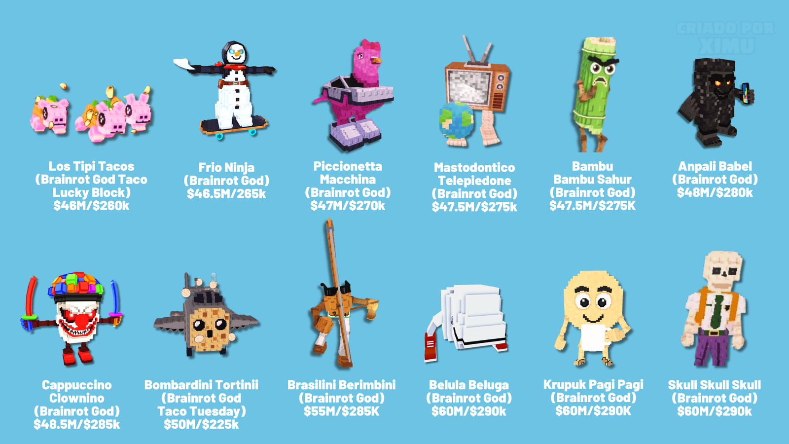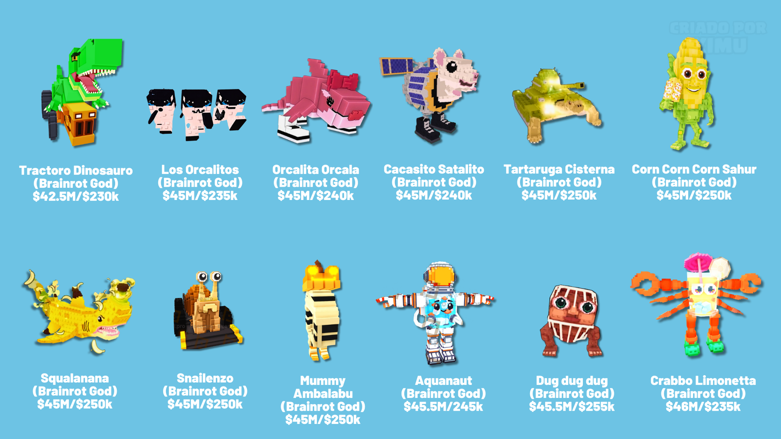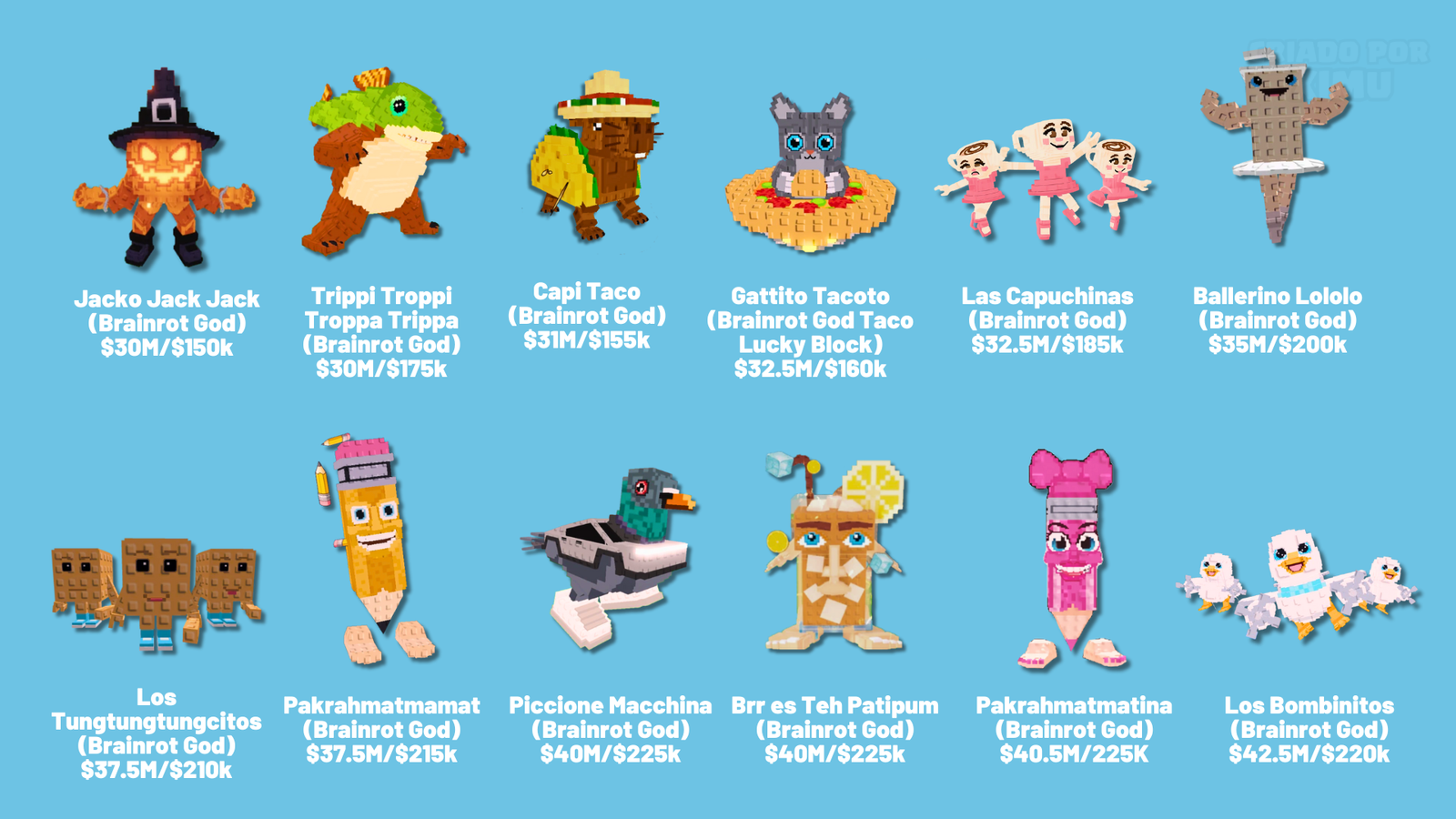 Here you will find all the Brainrots in the game! If any are missing, check the main page to see the recently added ones. (Link at the bottom of the page)