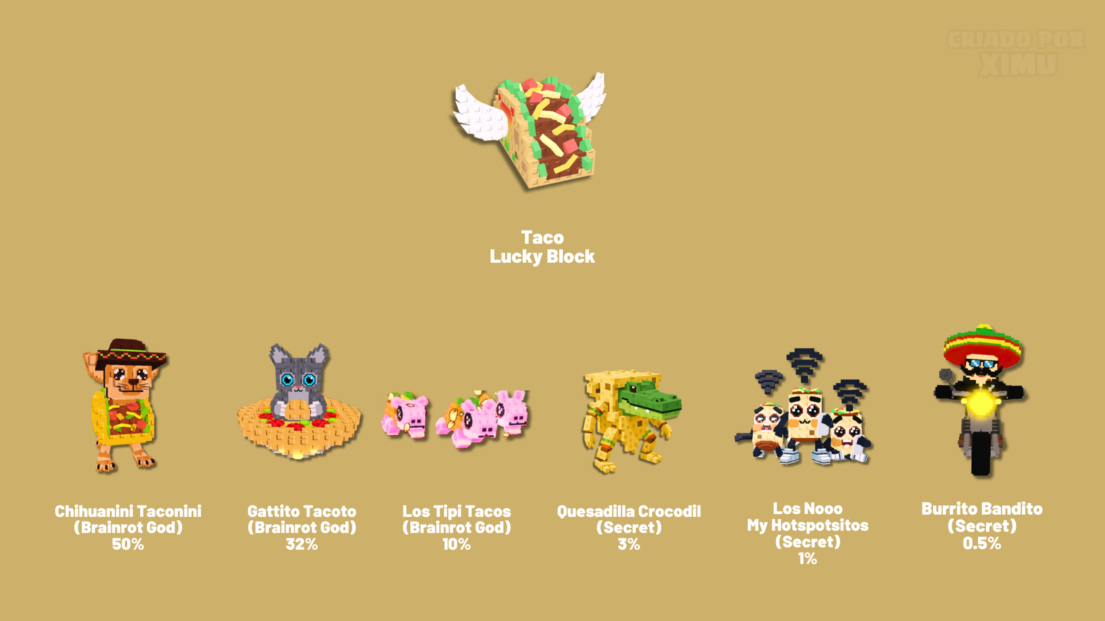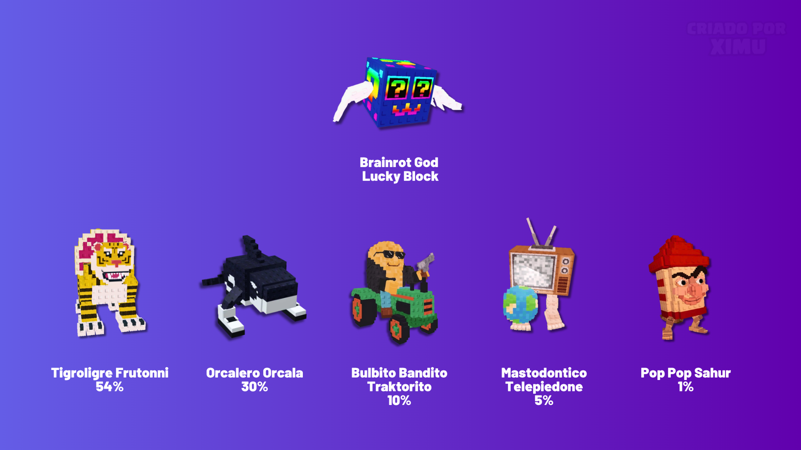 Here you will see all the Lucky Blocks in the game, which Brainrots can appear in them, and their probabilities.